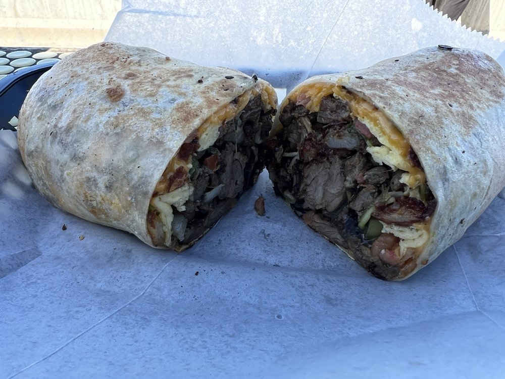 My partner got the carne asada breakfast burrito, he loved it. And he got a latte which he also liked.
