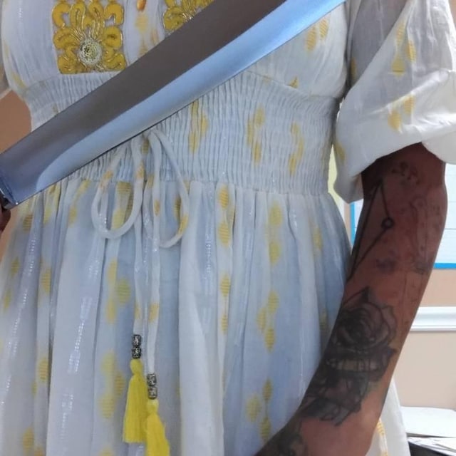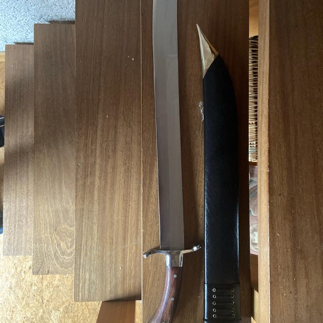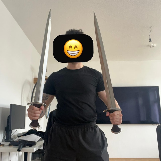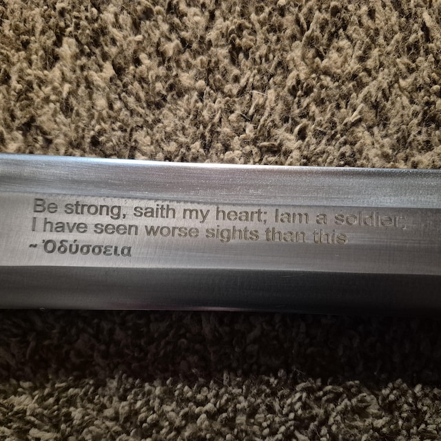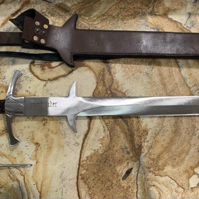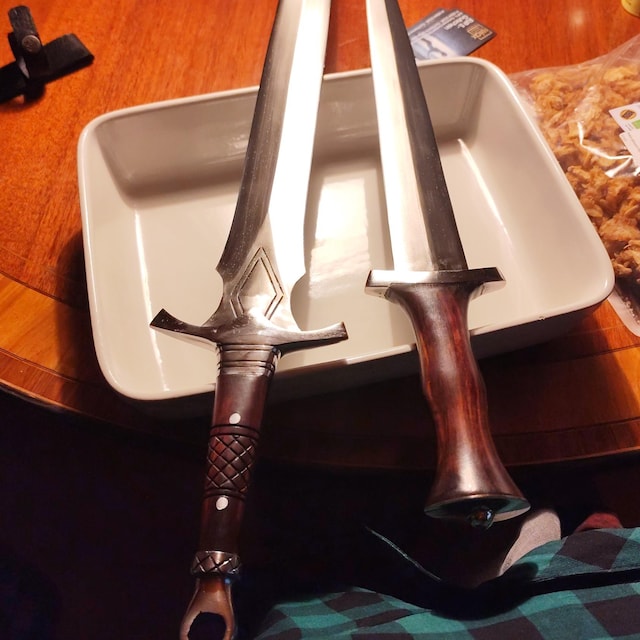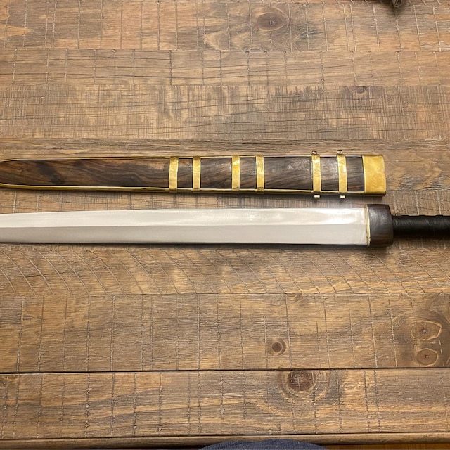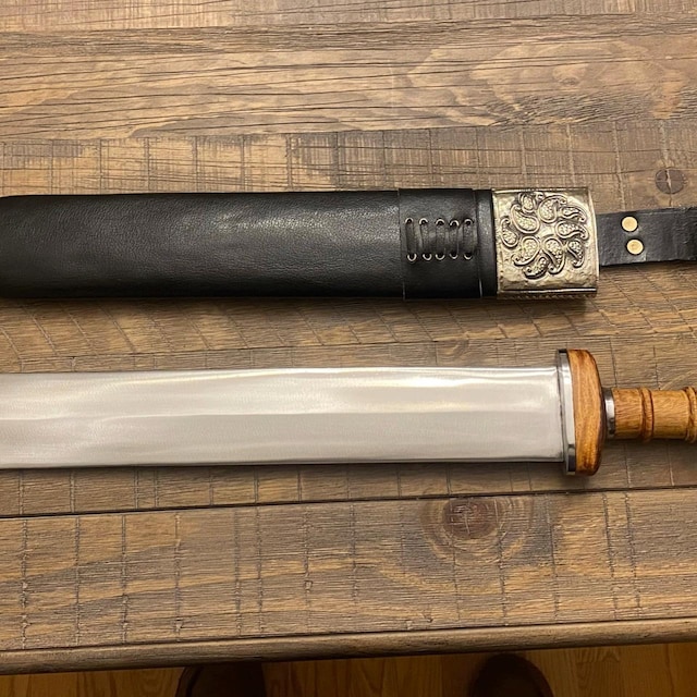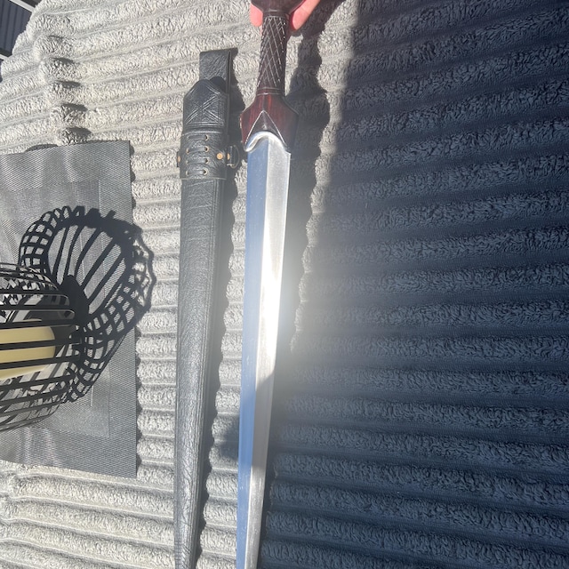 Thanks for the solid work. The sword is well-made — good geometry, straight fuller, and proper point of balance. It handles well without strain, and the grip is comfortable and secure, even with gloves. The blade is straight, with no looseness, and the finish is clean. Judging by its flexibility and ring, the steel seems to be 5160 or something similar — tough but not brittle, with a good weight. The tip is nicely shaped for both cutting and thrusting. The scabbard is neatly assembled, and the suspension system is reliable. The whole set feels like a functional weapon, not just a display piece. Overall — a very solid sword. Glad I chose this one.